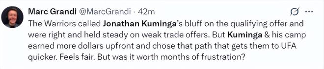 勇士记者马克-格瑞德写道:勇士队识破了乔纳森-库明加的虚张声势,拒绝了他想要球员选项的要求,并且在微不足道的交易报价中坚定立场。当然库明加也收获了相应的薪水,而且他可以更早的进入自由市场,这笔签约还算公平。但这几个月的拉扯真的值得吗?