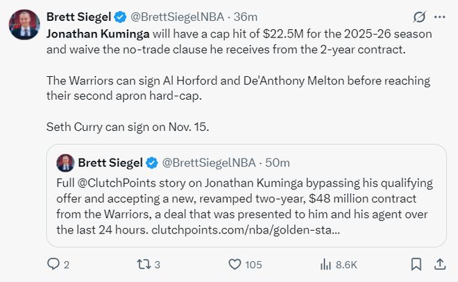 根据NBA记者Brett Siegel的解析:库明加25-26赛季的薪资为2250万,并且他将放弃这份为期两年合同中的交易否决权,勇士队可以在达到第二薪资上限之前签下霍福德与梅尔顿,赛思-库里可以在11月15日后签约。(签下小库里后球队就凑齐15+3名单)