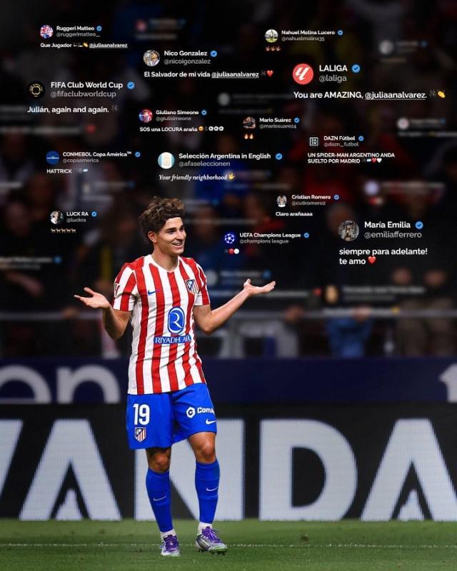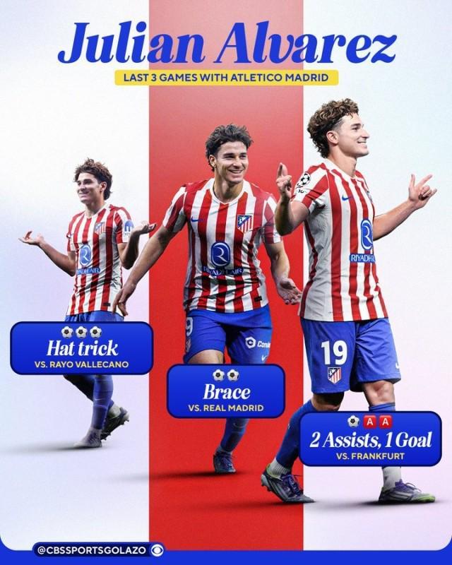 马竞5比1法兰克福,连续2场打入5球,近3场打入13球,阿尔瓦雷斯居功至伟。9月21日1比1客平马洛卡,小蜘蛛第63分钟被瑟洛特换下,大为不满的他爆了一句“每次都是我!(前5场西甲4次被换下)”,而9分钟后瑟洛特染红下场。正是在这场马黛茶杯里的风波之后,小蜘蛛彻底爆发:对巴列卡诺帽子戏法(3比2),对皇马梅开二度(5比2),对法兰克福1球2助(5比1),近3场比赛贡献6球2助攻!这3个主场他都打足了90分钟,对皇马和法兰克福只是第90分钟才被换下接受掌声。