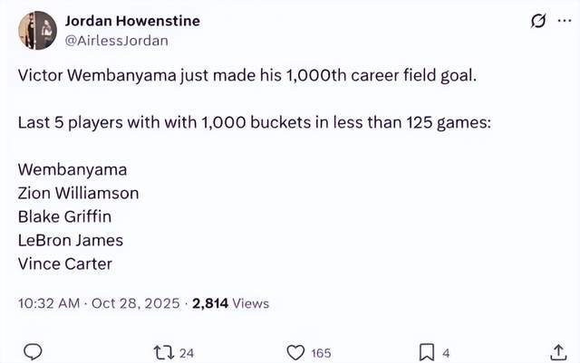 在刷新纪录之后,美媒《ClutchPoints》第一时间更新新赛季MVP榜单,文班亚马高居第一,力压约老师、字母哥、东契奇、亚历山大。名记杰克·菲舍尔强势发文: