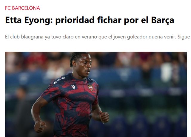 2025-26赛季西甲,效力于莱万特的21岁中锋埃塔-埃永大放异彩,8次出场,贡献5球3助,射手榜上排名第5,只落后姆巴佩(9球)、阿尔瓦雷斯(6球)。10月5日的《每日体育报》透露,巴萨盯上埃永,并将他视为优先引援目标。埃永的违约金为3000万欧元,切尔西、曼联也对他有意。